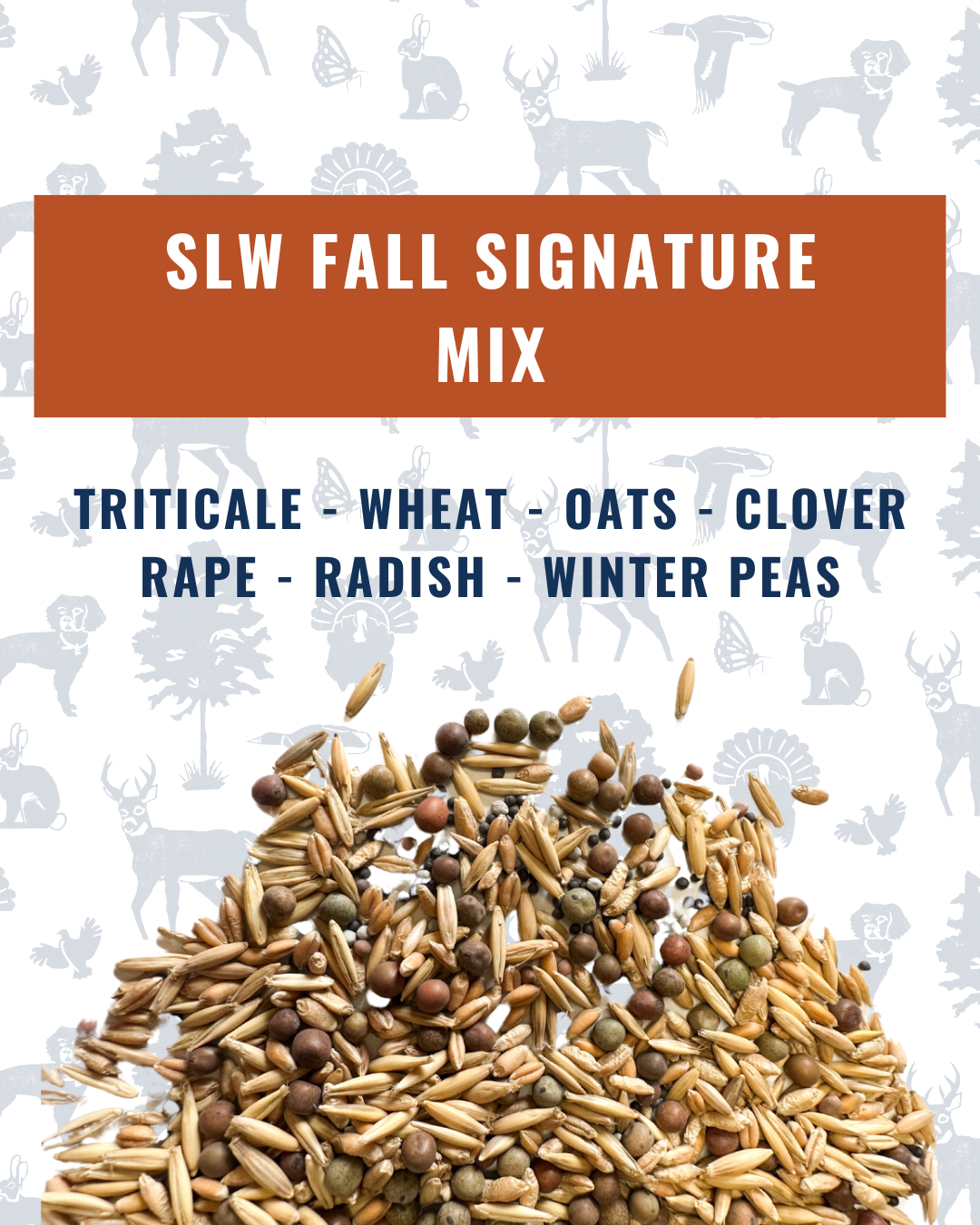 Our best-selling food plot mix to date! Attracts ALL wildlife species. Our SLW Fall Signature Mix is a robust mix of small grains, legumes, and brassicas to provide forage throughout the fall season and into winter.